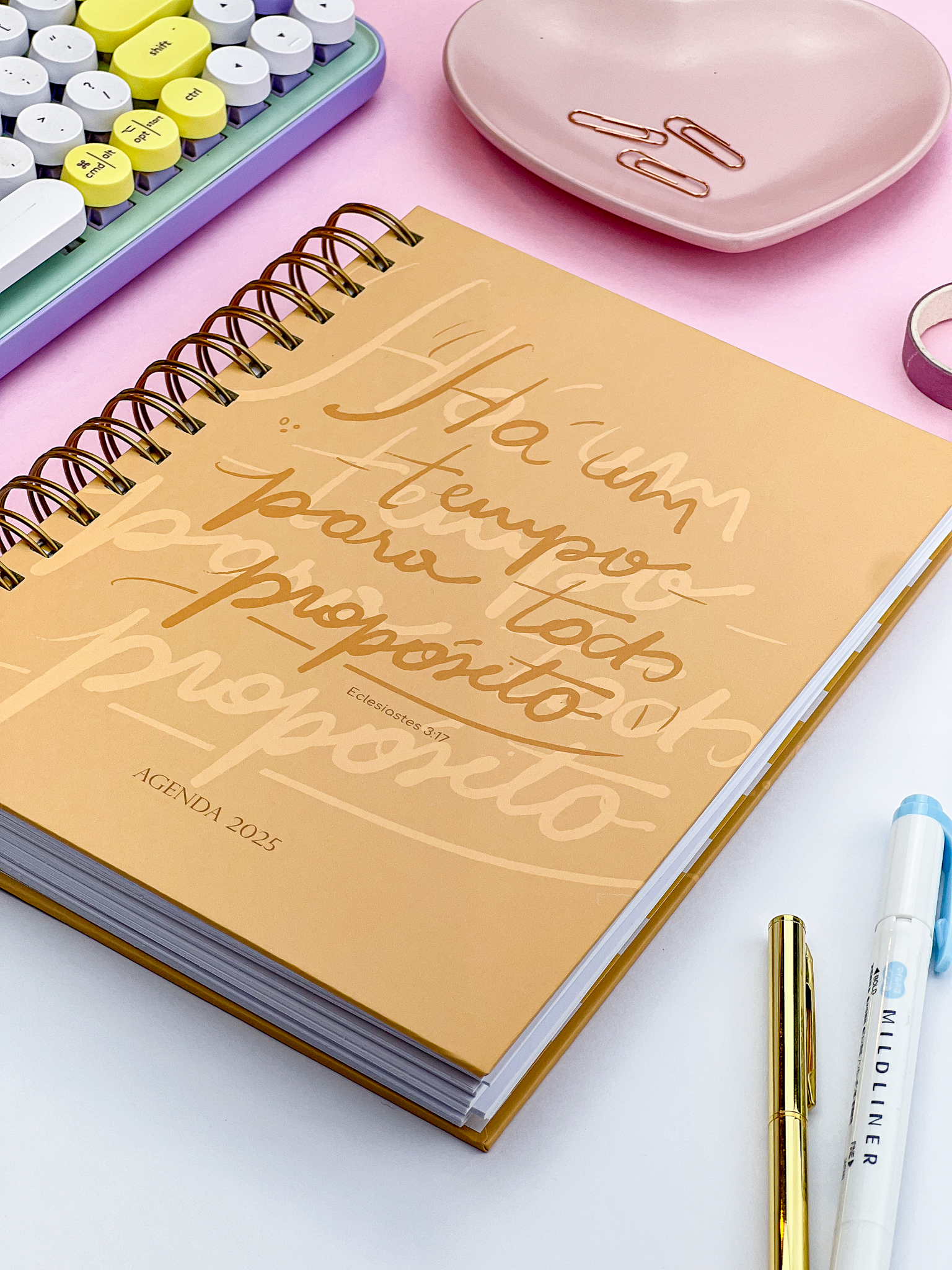 Pág de dados, calendário 25-26, lista telefonica, logins e senhas, controle de saúde, planejamento anual, metas do ano e controle financeiro de Jan a Dez.